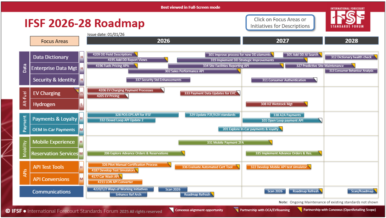 A: Conexxus and IFSF have worked closely together in 4Q25 to identify roadmap initiatives that will be worked jointly. These Openretailing initiatives are highlighted on the roadmap with tags.